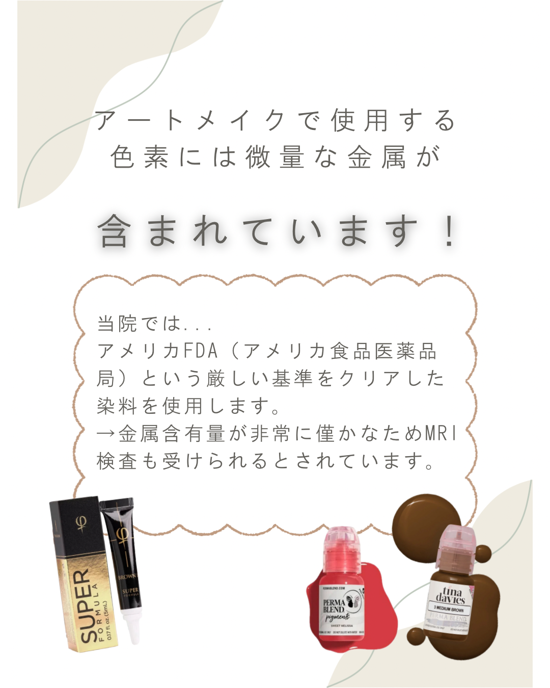 アートメイクで使用する色素(インク)には、ごく微量の金属成分が含まれていることがあります。